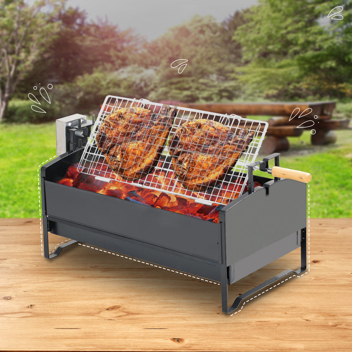 باربكيو مع مشبك شواء كهربائي قابل للدوران يتميز بوزنه الخفيف ، اذ يمكن حمله ونقله الى أي مكان بسهولة يمكن استخدامه في حديقة البيت ، او في الرحلات مع العائلة و الأصدقاء في الهواء الطلق يعمل هذا الباربكيو عن طريق الكهرباء، اذا يمكن شبكه بشكل مباشر في الكهرباء او عن طريق بطارية السيارة يمكن فصل مشبك الشواء عن هيكل الباربكيو ، و استخدامه لوحده شبك الشواء قابل للدوران و الحركة حتى تصل حرارة الشواء الى الأطعمة بشكلٍ متساوٍ يمكن استخدام الخشب الجاف أو الفحم عند الشواء ثم وضع المشبك مقبض شبك الشواء غير قابل لإيصال الحرارة فهو يحمي اليد من الحروق الباربكيو سهل التنظيف، و مقاوم للصدأ هيكل الباربكيو مصنوع من الستانلس ستيل الباربكيو أقل دخان شواء مما يعني بيئة صحية يمكن لهذا الباربكيو الشواء ل 3 الى 5 اشخاص متوفر باللون الأسود