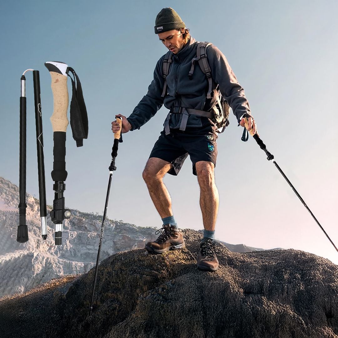 عصا المشي والتسلق القابلة للتمدد توفر توازنًا مثاليًا ومتانة عالية أثناء رحلات المشي الطويلة أو تسلق الجبال، بفضل تصميمها الخفيف والمريح والقابل للطي.