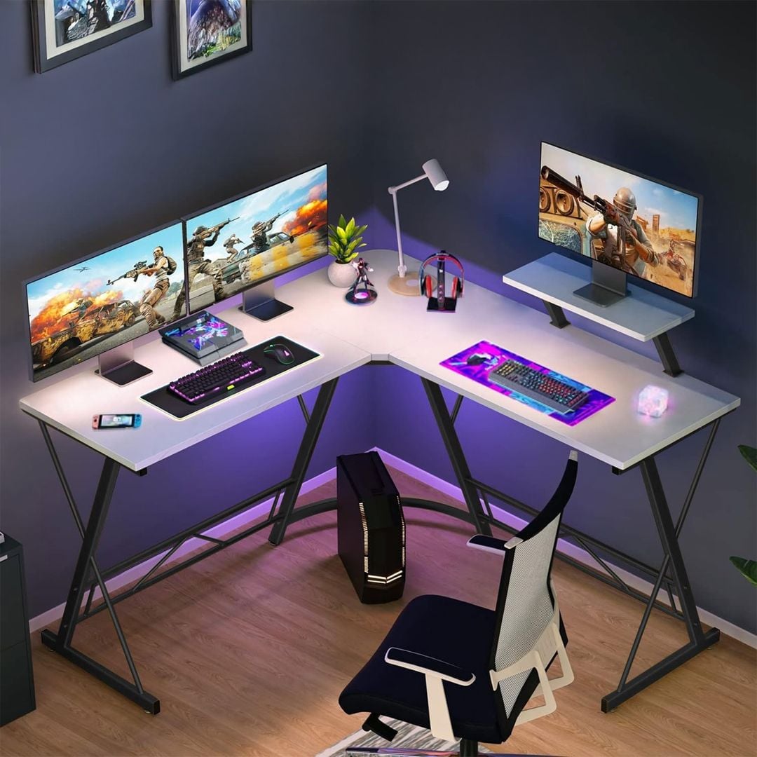 تصميم على شكل حرف L: يوفر مساحة عمل واسعة ومقسمة بشكل مثالي لتناسب أجهزة الكمبيوتر، الأوراق، والملحقات.