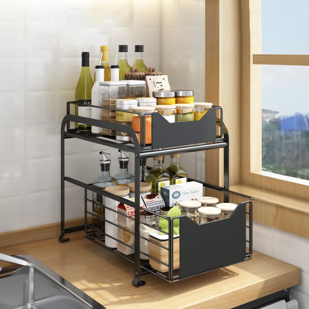رفوف تنظيم قابلة للسحب للخارج، مكونة من طبقتين، للمطبخ والحمام وخزانة المؤن وخزانة المكتب وسطح الطاولة
