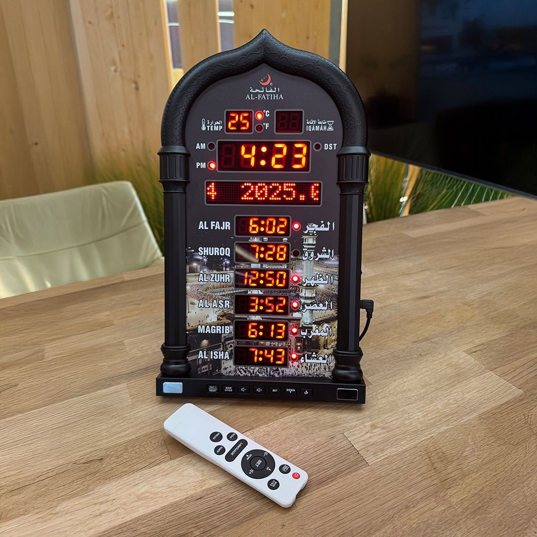 ساعة أذان رقمية باضاءة LED لعرض أوقات الصلوات الخمس خلال اليوم، ووقت إقامة الصلاة بالإضافة لمعلومات أخرى مثل: الساعة، تاريخ اليوم، درجة الحرارة تعرض الساعة الكثير من الأمور المتعلقة بالصلاة والأذان لأكثر من 6000 مدينة حول العالم تتميز بمكبر صوت لرفع الأذان بوضوح، حيث يمكنك اختيار صوت الأذان المفضل لديك كما يمكنك ضبط المنبه من خلالها أو ضبط منبه لتذكير بمواعيد الصلاة شاشة العرض متعددة اللغات مثل العربية، الانجليزية، الفرنسية، التركية وغيرها تأتي مع جهاز تحكم لتحديد اللغة وصوت الأذان والساعة والتاريخ واليوم ! يمكنك أيضا التحكم بالإعدادات من خلال جهاز التحكم أو من الأزرار الموجودة على الساعة تعمل من خلال وصلها بالكهرباء مناسبة للاستخدام في المنازل والمساجد والمدارس وغيرها