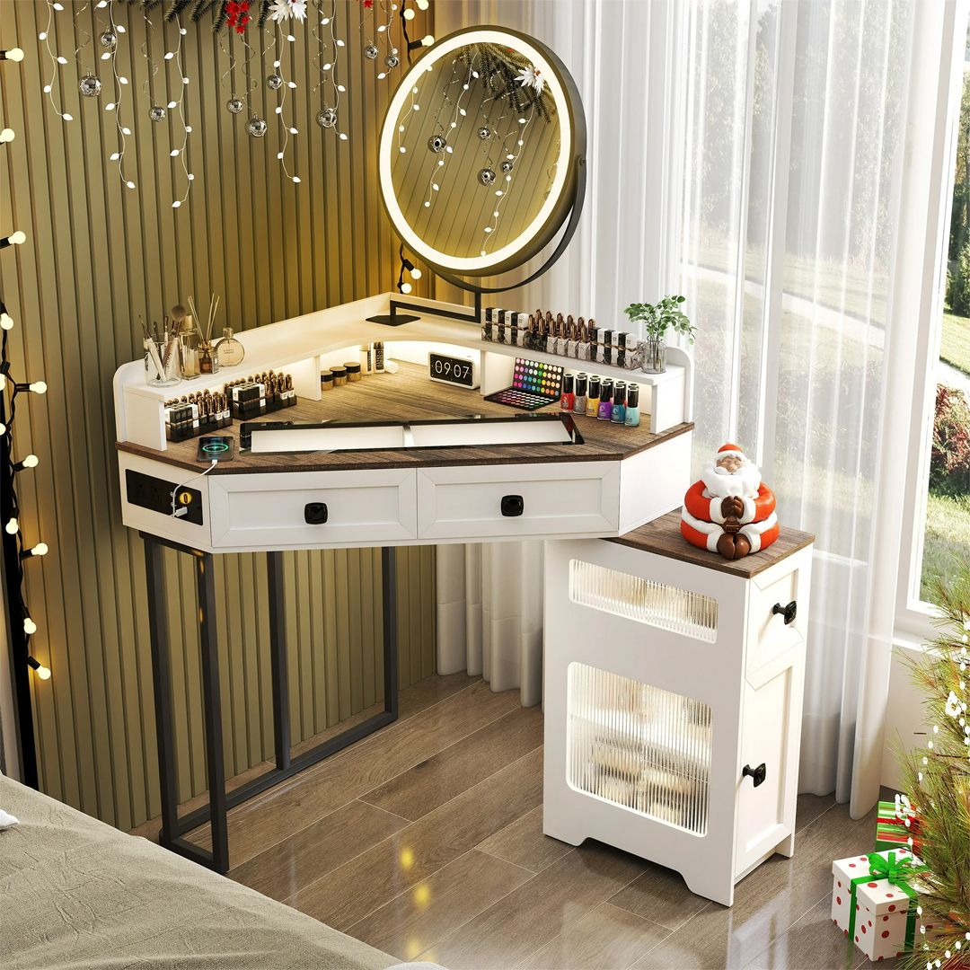 طاولة مكياج زاوية بتصميم ذكي وعصري، مزودة بمرآة LED دائرية، مستشعر حركة، تحكم بالإضاءة، ومنافذ شحن USB وType-C، بالإضافة إلى مخارج كهرباء مزدوجة.