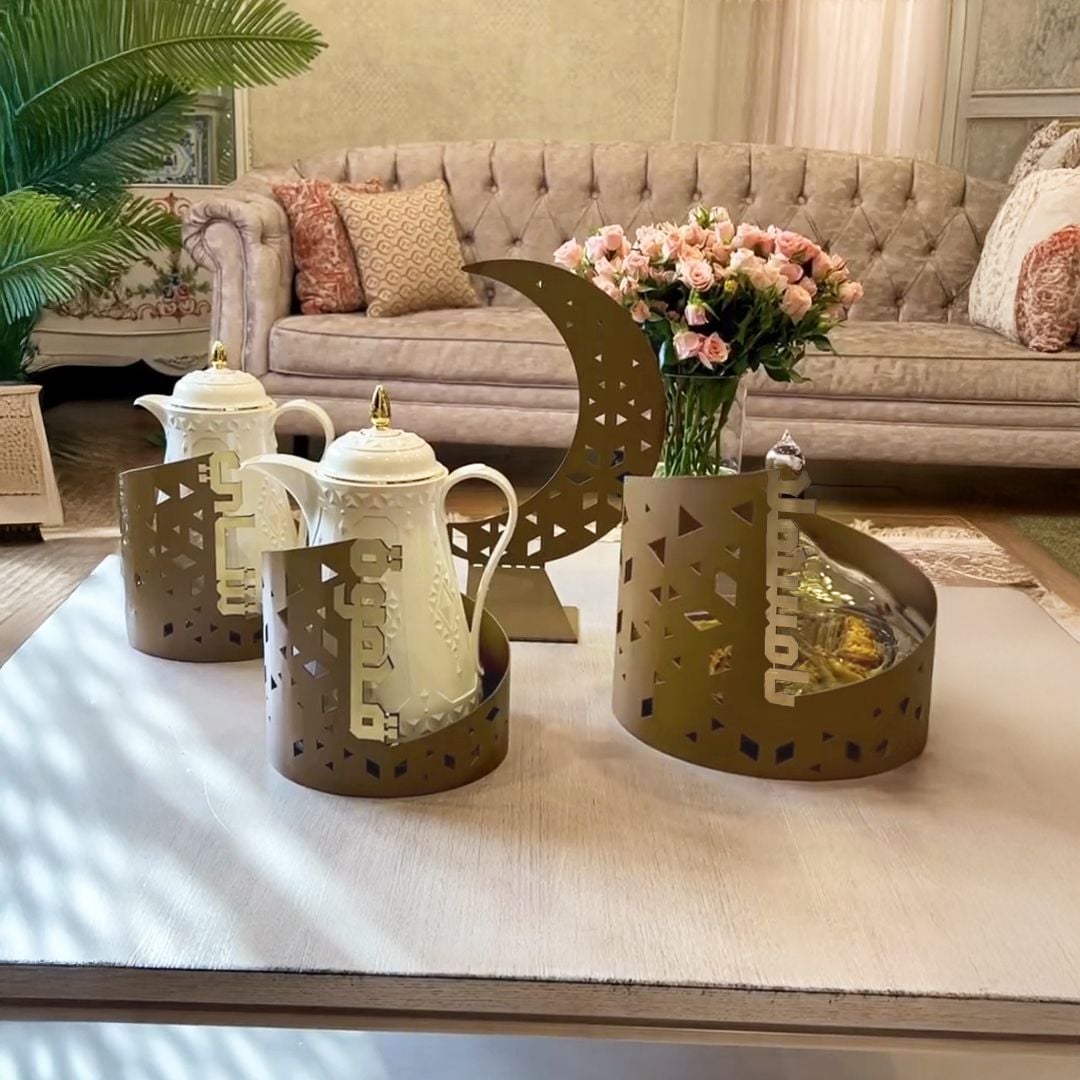 طقم تقديم رمضاني فاخر مستوحى من أجواء الشهر الفضيل، يضم ستاند للقهوة، ستاند للشاي، ستاند بكلمة يا مسهلا، ماعوناً للحلويات، ومجسم هلال أنيق. مصمم بلمسات ذهبية راقية ليضفي جمالاً على جلساتك الرمضانية