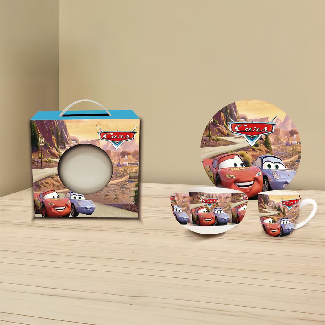 طقم سيراميك للأطفال مكوّن من طبق وصحن وكوب بطباعة شخصيات السيارات، تصميم عملي وممتع للمائدة اليومية والهدايا.