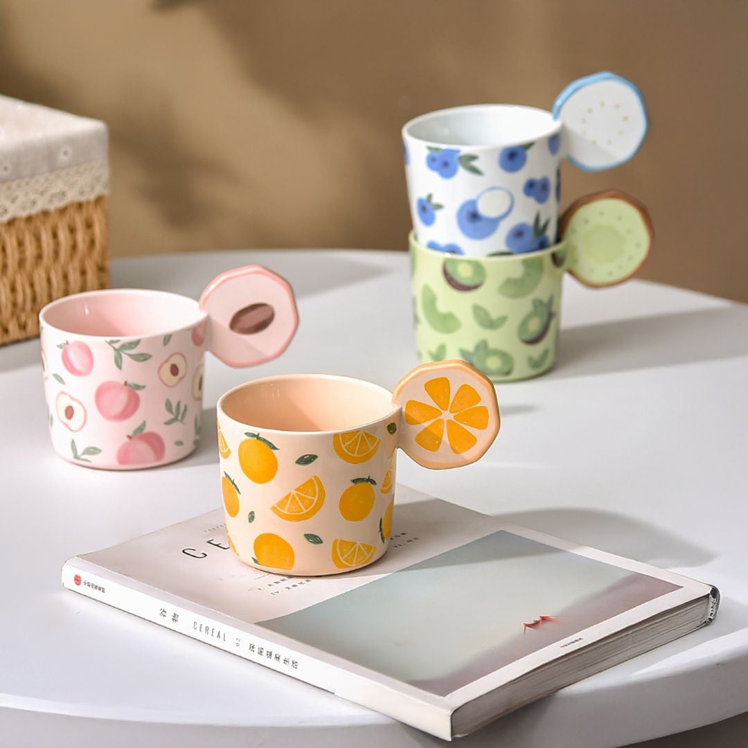 كوب سيراميك بطبعات فواكه صيفية عملي للمشروبات اليومية في البيت أو المكتب.