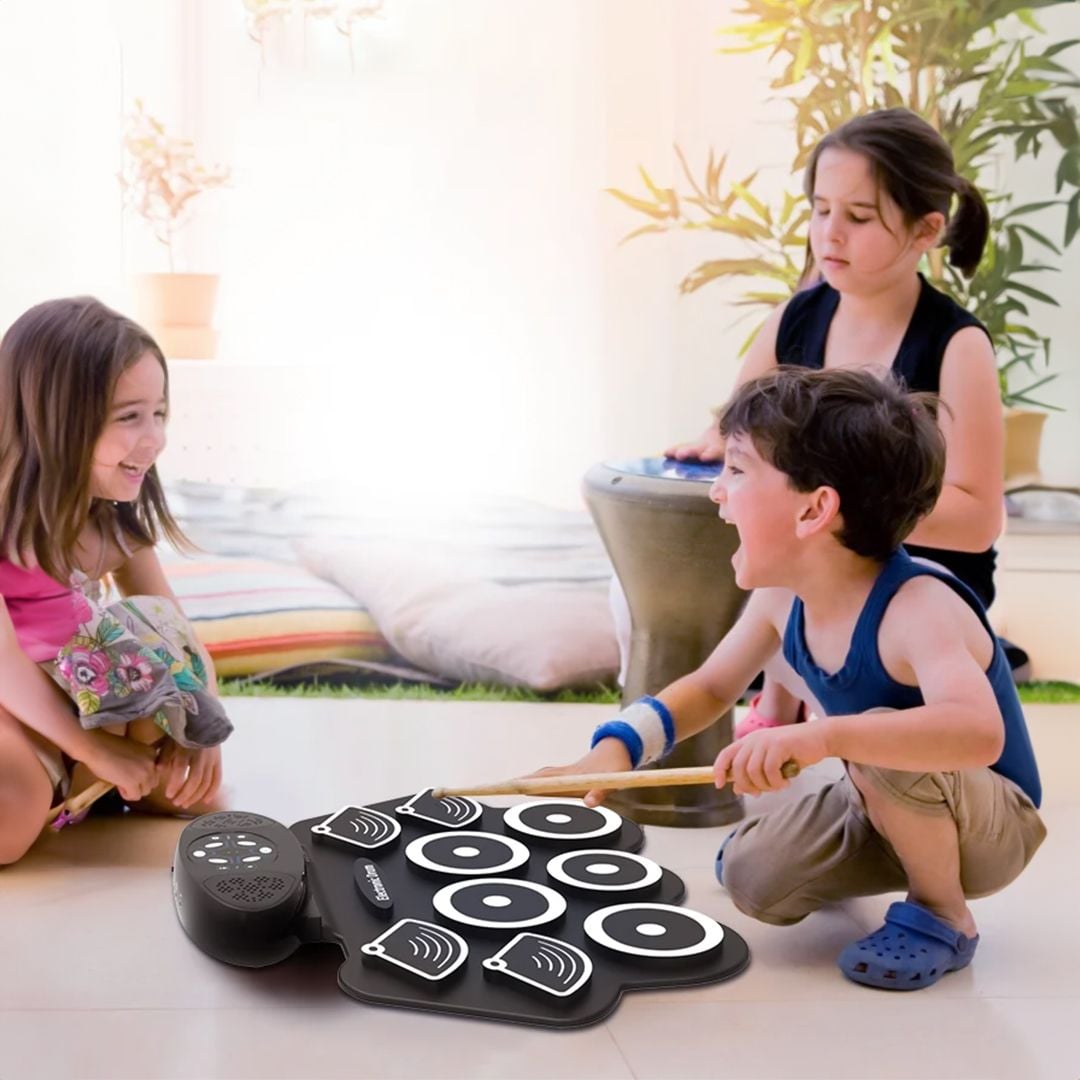 مجموعة طبول كهربائية محمولة من 9 وسادات مكبرات صوت ستيريو ومقبس AUX يدعم مخرج سماعة الرأس 3.5 ملم، مما يسمح لك باللعب في أي مكان تشعر فيه بالإلهام للطبل بدون حواجز أو إزعاج. 7 نغمات طبل و10 أغاني تجريبية و9 إيقاعات طبلة اختيارية لأنماط الموسيقى المختلفة. يسمح لك زر التسجيل بتسجيل إيقاعاتك، وظيفة تسجيل أداء طويلة للغاية لمدة 180 ثانية تتيح لك الاستمتاع بإبداعك! تعمل بالطريقتين من خلال الكهرباء او من خلال الشحن
