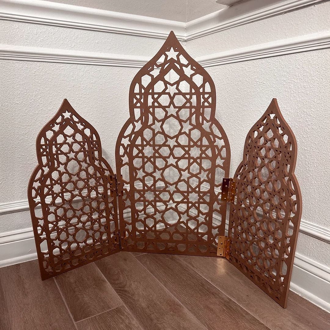 ديكور خشبي أنيق بتصميم مزخرف مستوحى من الطراز الإسلامي ومفصلاته الذهبية الفاخرة، يعد خيارًا مثاليًا لتزيين المساحات وإضفاء طابع روحي وجمالي في أي مكان.