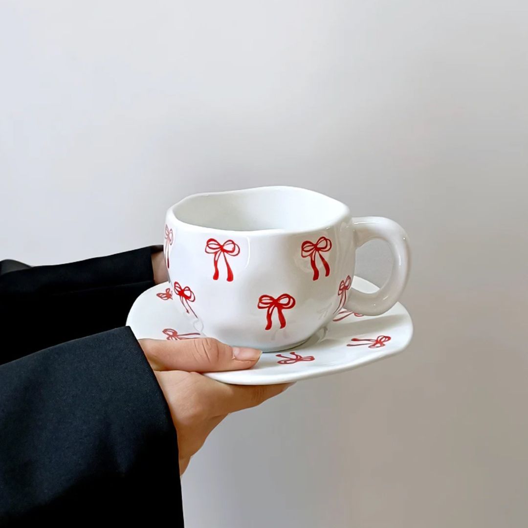 فنجان عصري مزخرف بفيونكات حمراء تضيف لمسة أنثوية وأنيقة إلى جلساتك اليومية.