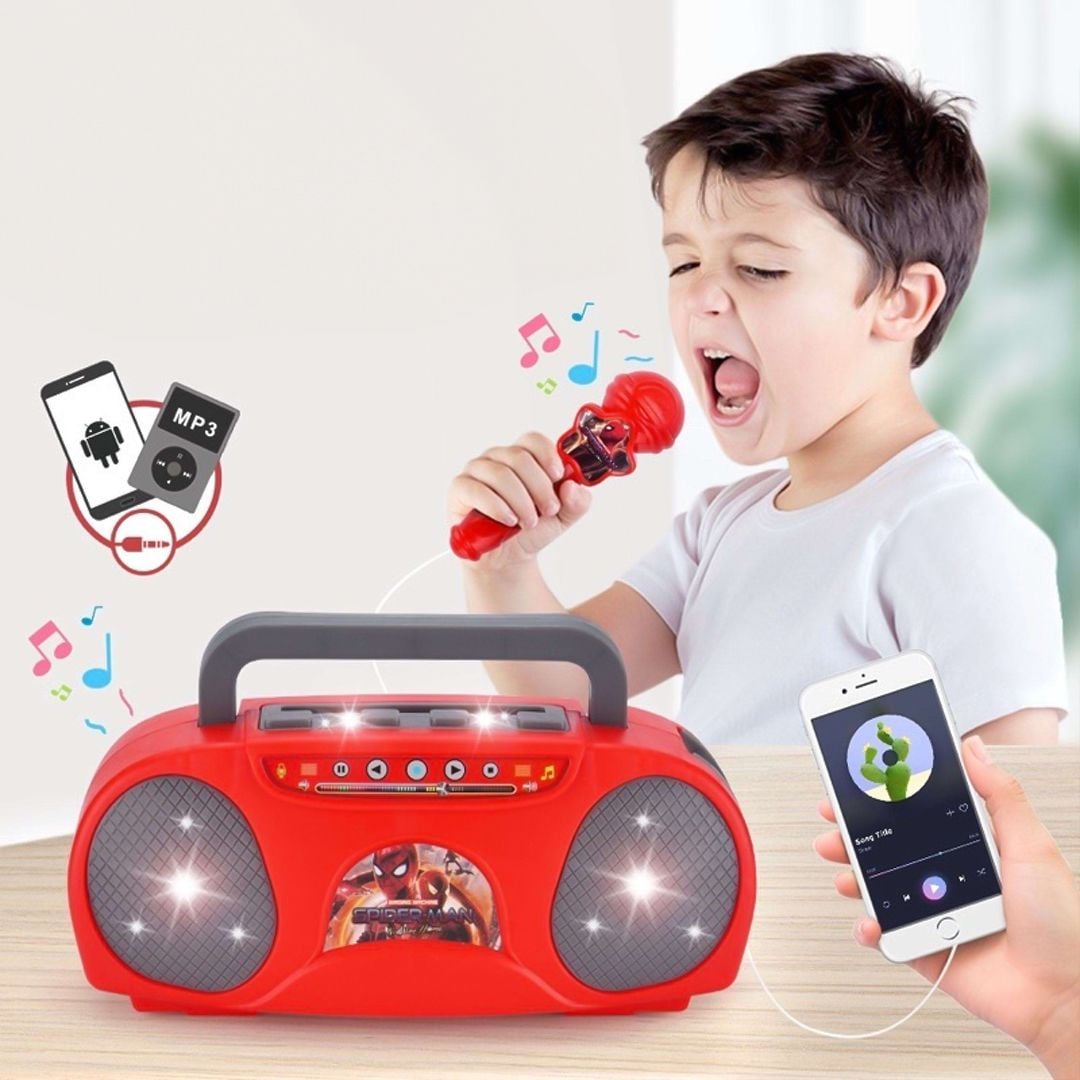 جهاز كاريوكي على شكل راديو مع مايكروفون للأطفال ، يمكن وصله بالهاتف للغناء و الإستماع للأغاني بصوتك