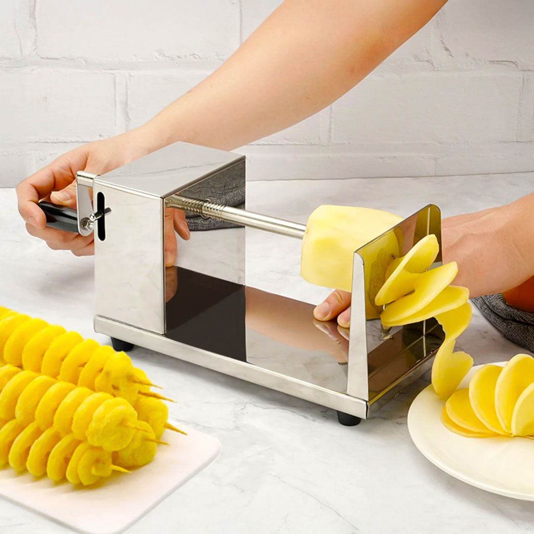 حوّل البطاطس إلى شرائح لولبية شهية بسهولة واحترافية—ماكينة متينة من الستانلس ستيل لنتيجة متناسقة في ثوانٍ.