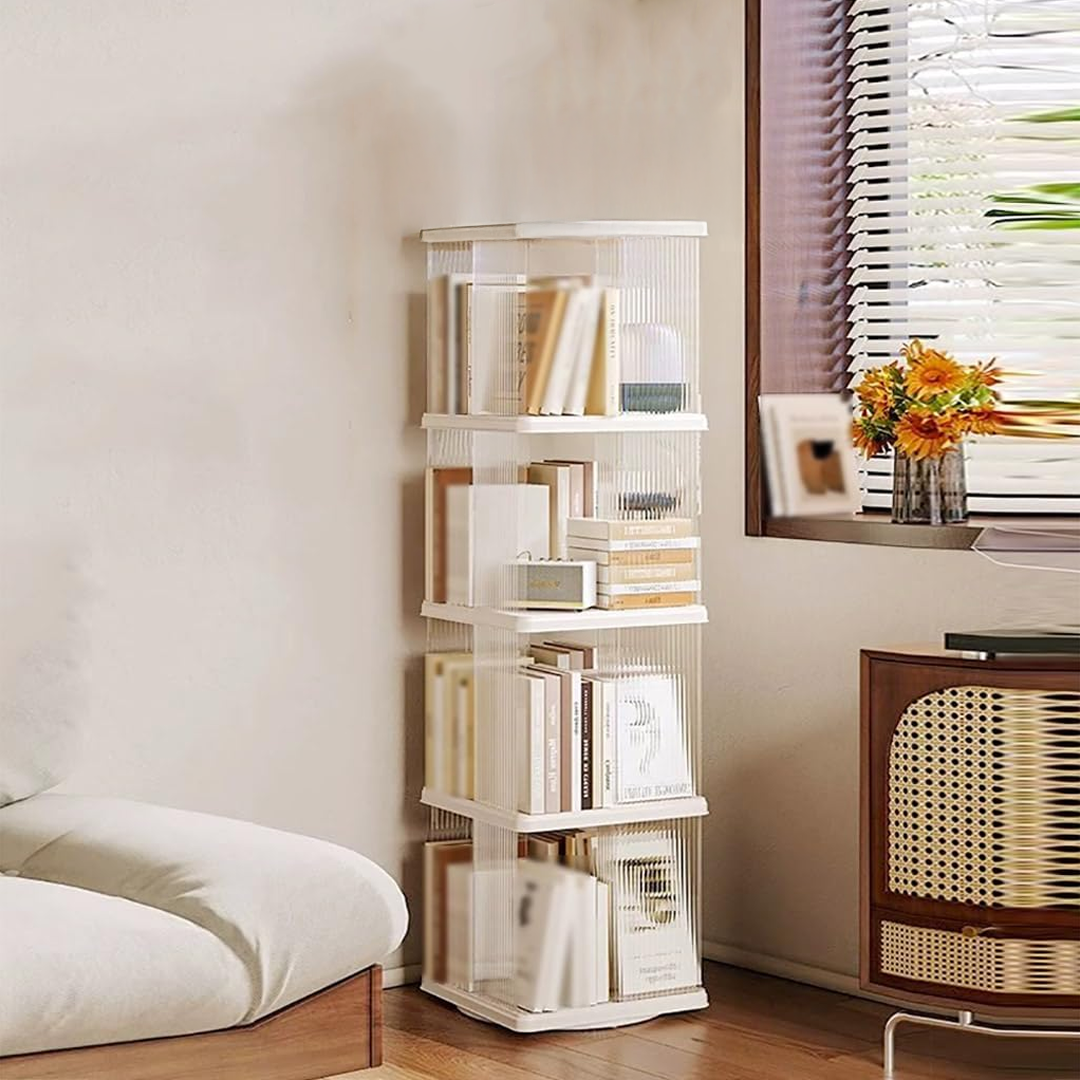 مكتبة أكريليك عصرية مكونة من أربع رفوف واسعة مع قاعدة دوّارة، مصممة لتوفير تنظيم مثالي للكتب والديكورات