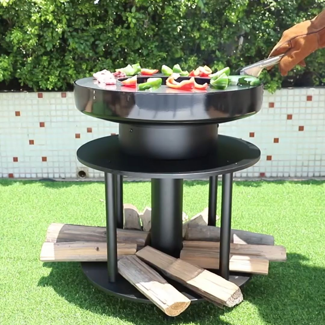 موقد للتدفأة والشواء على شكل حفرة نار دائرية، مزود بمكان مخصص لتخزين الحطب، مع أرجل مرتفعة عن الأرض ومقاومة للحرارة