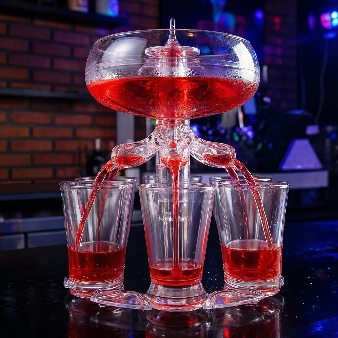 بمجرد سكب المشروب في الخزان العلوي، يبدأ السائل بالانسياب بسلاسة عبر فتحات التوزيع ليملأ عدة أكواب دفعة واحدة بتوازن مثالي. تقديم سريع، توزيع متساوٍ، وتجربة مبهرة تجعل ضيوفك ينبهرون بطريقة التقديم قبل حتى تذوق المشروب.
