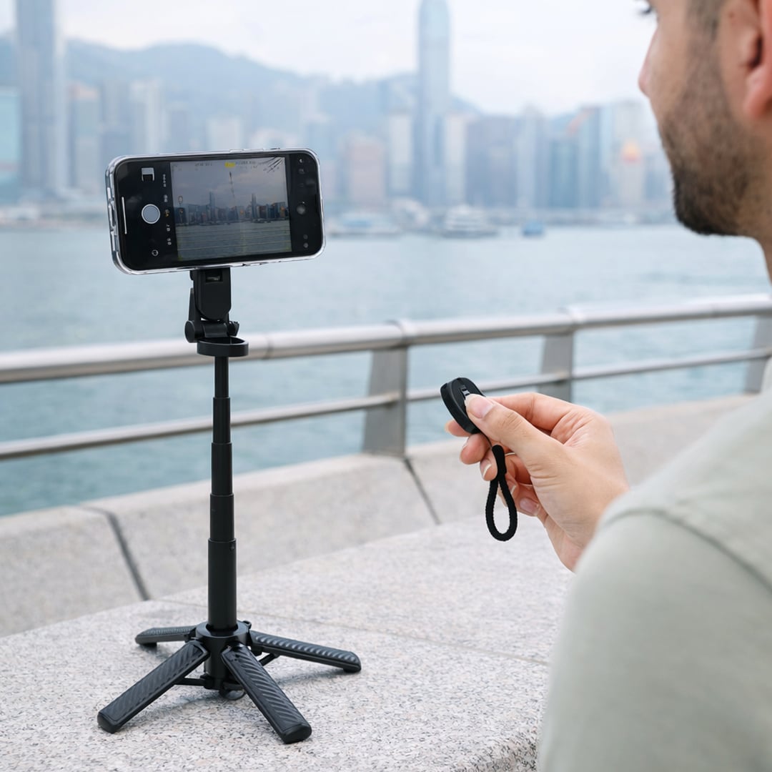 مزود بجهاز تحكم بلوتوث عملي يعمل بزر واحد فقط، يمنحك تحكمًا سريعًا وسلسًا في التقاط الصور والفيديوهات عن بُعد حتى مسافة تصل إلى 10 أمتار. يمكنك التصوير بحرية كاملة دون الحاجة للمس الهاتف، ما يتيح لك زوايا أوسع ولقطات أكثر احترافية.