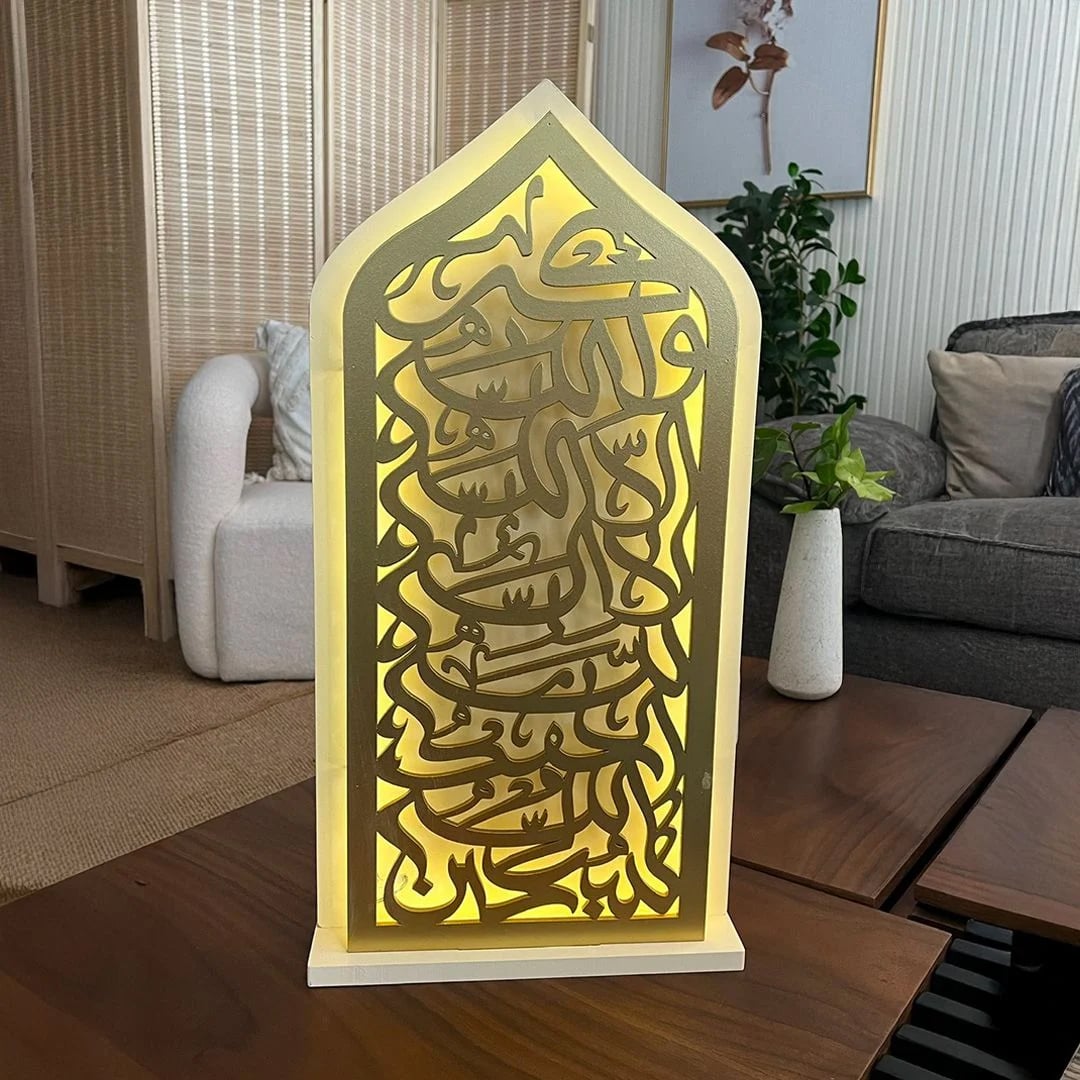 قطعة ديكور رمضانية مضيئة بتصميم معماري فاخر مستوحى من الأقواس الإسلامية الأصيلة يجمع بين الهيبة الروحانية والجمال البصري الآسر حيث تتوسط القطعة عبارات إيمانية عظيمة محفورة بالخط العربي الأصيل" الله أكبر الحمد لله لا إله إلا الله " لتتحول من مجرد ديكور إلى رسالة إيمانية متوهجة تحضر بقوة في المكان وتعكس روح الشهر الكريم بكل سكينة وجلال من روح.