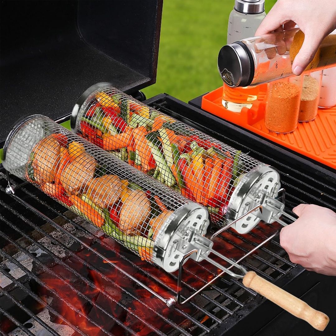 سلة شواء دوّارة مصممة لشواء متساوٍ ومثالي لمختلف أنواع الطعام، مع مقبض مريح وآمن للاستخدام اليومي في حفلات الشواء أو الطبخ الخارجي