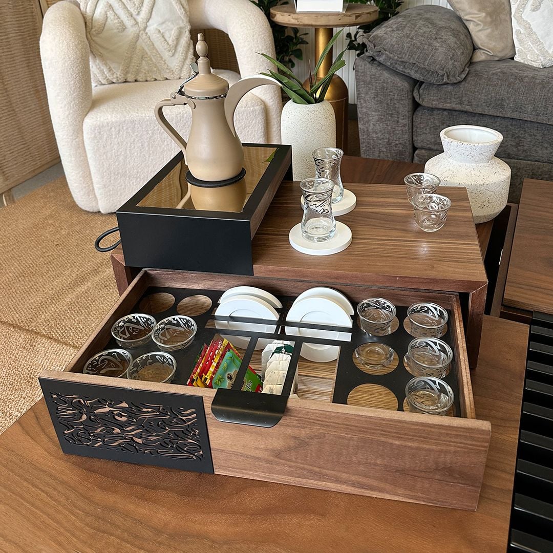 درج ضيافة ذكي… ترتيب يُرى ويُحس: درج سفلي واسع وسلس الحركة، صُمّم ليستوعب أدوات الضيافة بأسلوب منظم وأنيق و يمكن وضع مغلفات المشروبات المختلفة، ويحتوي على: - استكانات شاي زجاجية شفافة ومزخرفة - فناجين قهوة عربية بتصميم أنيق - قواعد أكواب مرافقة توزيع داخلي ذكي يحافظ على ثبات القطع ويجعل كل تفصيلة في مكانها، حتى مع الاستخدام المتكرر واليومي.