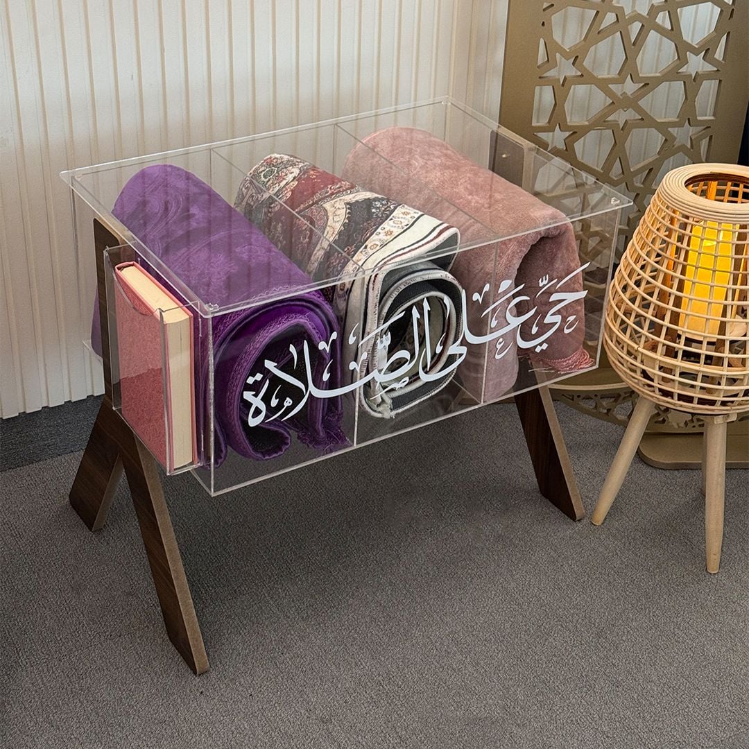 صندوق أكريليك عالي النقاء والشفافية يمنح محتوياته عرضًا أنيقًا أشبه بواجهة فنية روحانية، مع حماية كاملة من الغبار والعوامل الخارجية. المصحف ومستلزمات الصلاة تبقى محفوظة، مرتّبة، ونظيفة دائمًا، في مشهد يجمع بين القدسية والجمال.