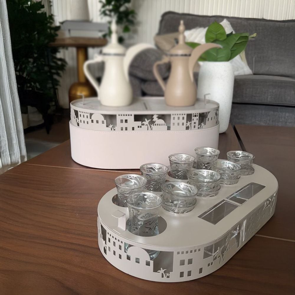 تجربة ضيافة تُرافقك أينما كانت الجلسة: الميزة الجوهرية في هذا الصندوق هي قابليته العالية للتنقّل، ليكون الخيار المثالي للجلسات الخارجية، الطلعات البرية، الرحلات، الاستراحات، والمناسبات المفتوحة. ضيافة كاملة جاهزة للحمل دون التضحية بالأناقة أو التنظيم، تزيّن الجوانب بنقوش معدنية محفورة بدقة مستوحاة من مشاهد العمارة العربية التقليدية؛ أقواس، نوافذ، نخيل، ومآذن تتداخل بتناغم فني يعكس أصالة المكان ودفء التفاصيل. هذه الزخارف لا تُعد مجرد عنصر جمالي، بل تحوّل القطعة إلى مشهد بصري يحاكي المجالس العربية العتيقة ويستحضر أجواء الحارات والبيوت التراثية بروح معاصرة راقية.