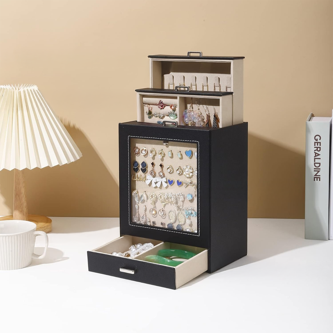 تقسيم عملي وذكي: يحتوي الصندوق على أقسام متعددة تناسب جميع أنواع الإكسسوارات، بما في ذلك فتحات منظمة للأقراط، خطافات لتعليق القلائد الطويلة، وفواصل داخلية لتخزين الأساور والخواتم.