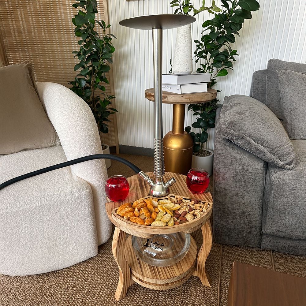 تصميم ذكي يجمع الأرجيلة والتسالي: سطح علوي دائري بتقسيمات مدروسة يتيح وضع الأرجيلة مع أقسام مخصصة للتسالي، المكسرات، أو الإكسسوارات، ليبقى كل شيء في متناول اليد دون تشويش أو فوضى. تصميم يخدم الجلسة ويجعلها أكثر راحة وانسيابية.