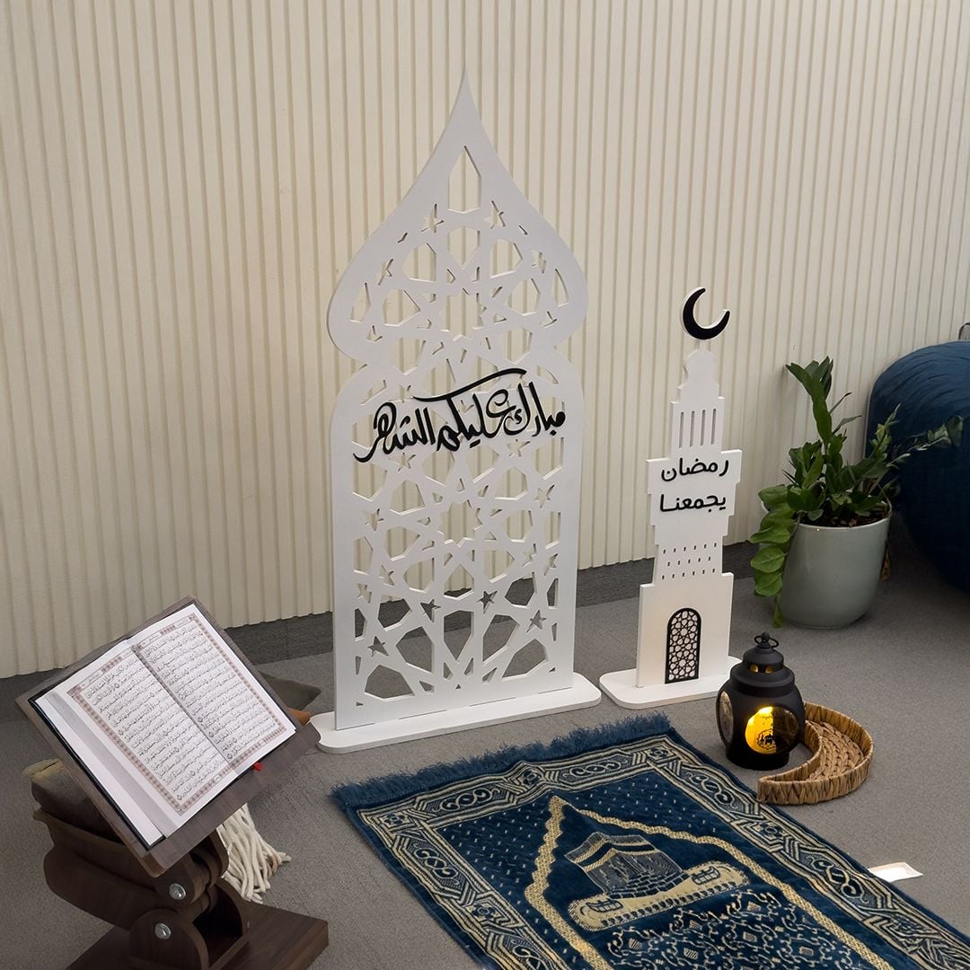 تصميم رمضاني يجمع المعنى والجمال: تضمّ المجموعة ستاند مزخرف بعبارات «مبارك عليكم الشهر» و «رمضان يجمعنا» محفورة بأسلوب إسلامي راقٍ، إلى جانب قطعة على شكل مئذنة تعكس رمز الصلاة والنداء الروحي. هذا التناغم بين العبارة والمئذنة يخلق تكوينًا بصريًا يحمل رسالة ترحيب دافئة تعبّر عن قدسية الشهر وجمال معانيه.