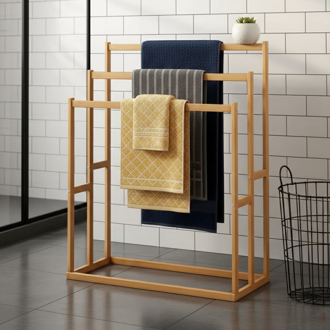 أضف لمسة دفء وأناقة طبيعية لحمامك مع ستاند المناشف الأرضي المصنوع من الخيزران، تصميم عملي بلمسة ديكور راقية يحافظ على ترتيب المناشف ويمنح مساحتك طابعًا هادئًا وعصريًا في آنٍ واحد.