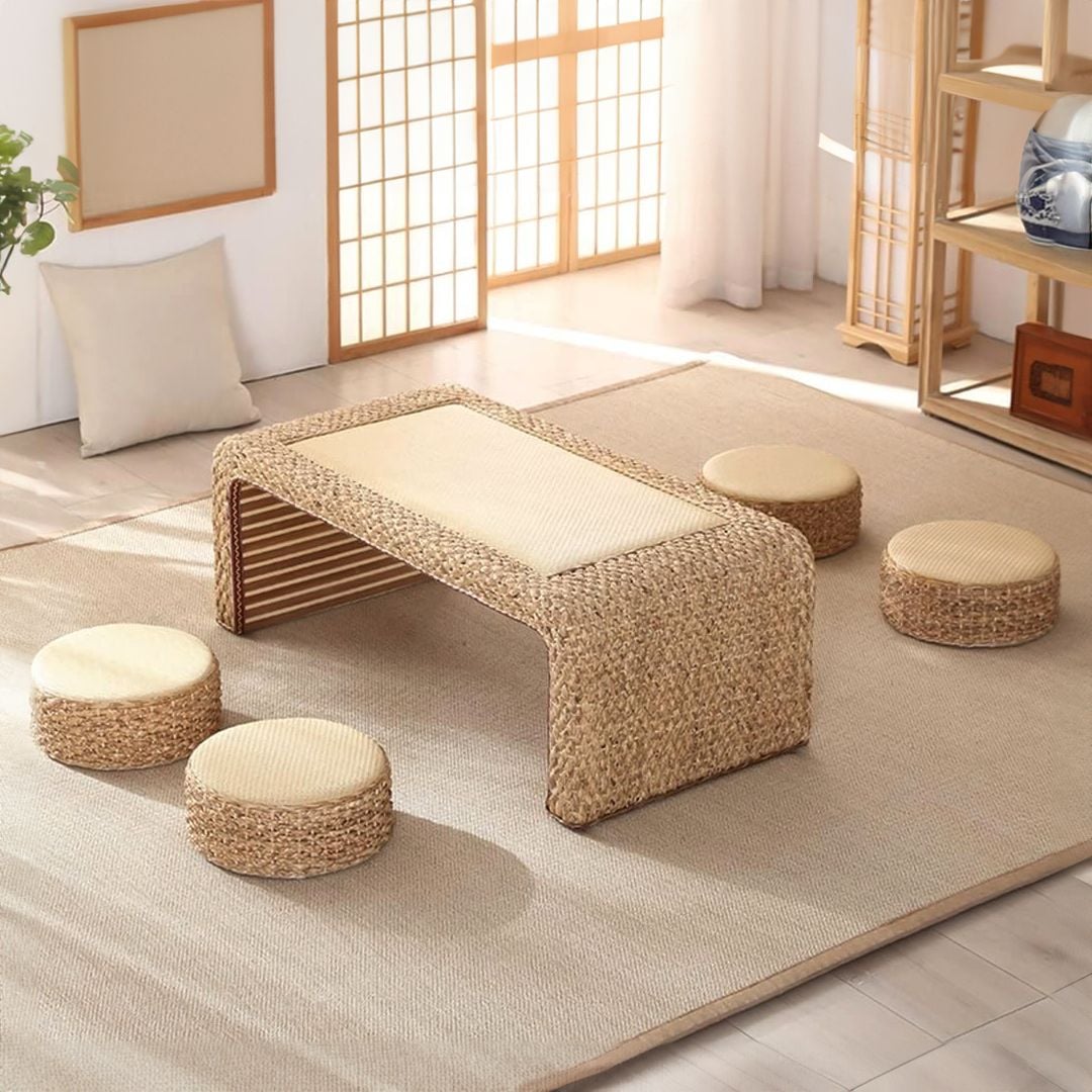 طاولة الجلسة الارضية بتصميم ياباني، تجربة استرخاء فريدة! مع أربع كوشينات للجلوس بتصميم مميز