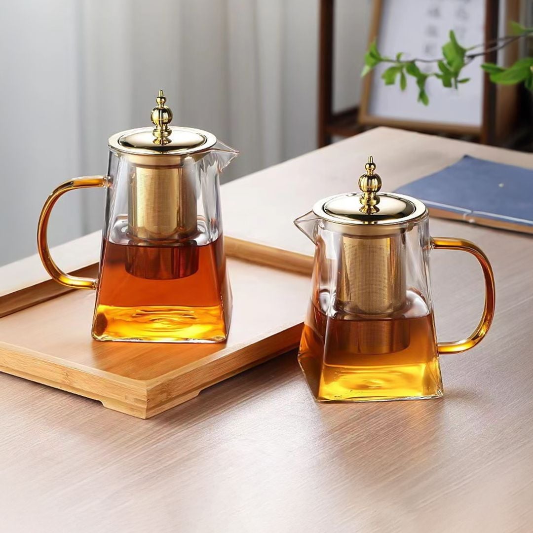 استمتع بفخامة الضيافة مع إبريق شاي زجاجي بتفاصيل ذهبية راقية، يجمع بين الأناقة والعملية لتحضير الشاي والأعشاب بأسلوب عصري مميز.