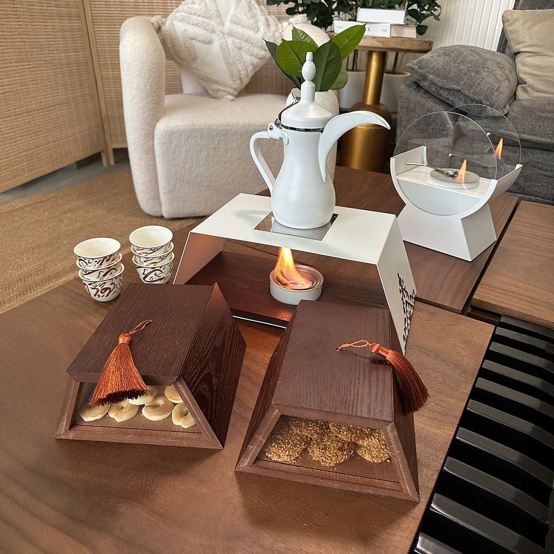 مساحة مخصّصة ومهيّأة بعناية لوضع وإشعال مصدر الحرارة بشكل آمن ومرتب، تمنحك سهولة كاملة في تحضير وتقديم القهوة بدرجة الحرارة المناسبة داخل المجلس أو في مختلف الجلسات، لتبقى القهوة جاهزة دائمًا بأناقة ودون أي تعقيد.