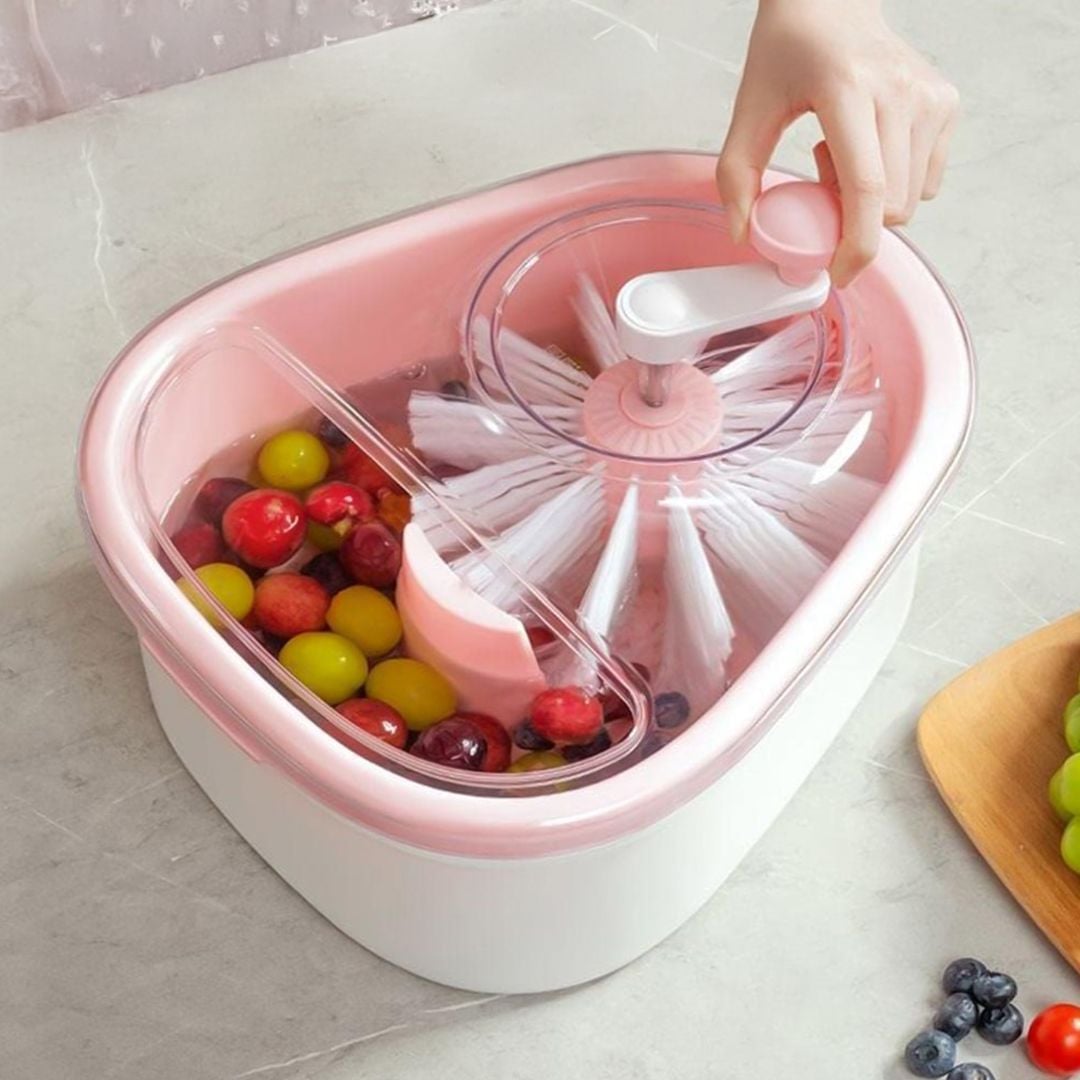 تصميم عملي وحديث: يتميز الوعاء بشكل مبتكر يناسب مختلف أنواع الأطعمة ويوفر سهولة في الاستخدام. نظام غسل يدوي بالدوران: مزود بمقبض دوار يساعد على غسل الفواكه والخضروات بسهولة وبشكل موحد لإزالة الأوساخ والشوائب. فرش تنظيف مدمجة: يحتوي على فرش تنظيف ناعمة تعمل على تنظيف الخضروات والفواكه بلطف دون إتلافها. مادة عالية الجودة: مصنوع من مواد متينة وآمنة للاستخدام مع الطعام، مقاومة للصدأ وسهلة التنظيف. غطاء شفاف: مزود بغطاء شفاف يحمي الماء من الرذاذ أثناء الغسيل ويوفر رؤية واضحة أثناء الاستخدام. متعدد الاستخدامات: يمكن استخدامه لغسل الفواكه، الخضروات، وحتى تنظيف الأطعمة الصغيرة مثل التوت أو العنب.