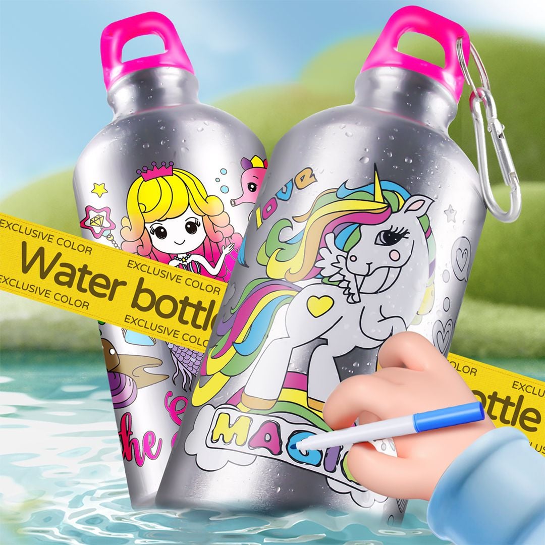 زجاجة ماء مصنوعة من الاستانلس تحفظ البرودة، يلونها الطفل بنفسه باستخدام اقلام التلوين المرفقة ويمكنه اضافة بعض الملصقات، والاحتفاظ بها واستخدامها بعد اضافة لمساته الفنية عليها