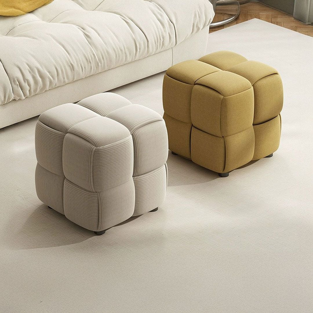 كرسي مكعب مبطّن بتصميم عصري وأنيق، يُستخدم كمسند قدم أو كرسي إضافي، يجمع بين الراحة والتصميم الأنيق، مثالي لإكمال ديكور غرف الجلوس أو غرف النوم