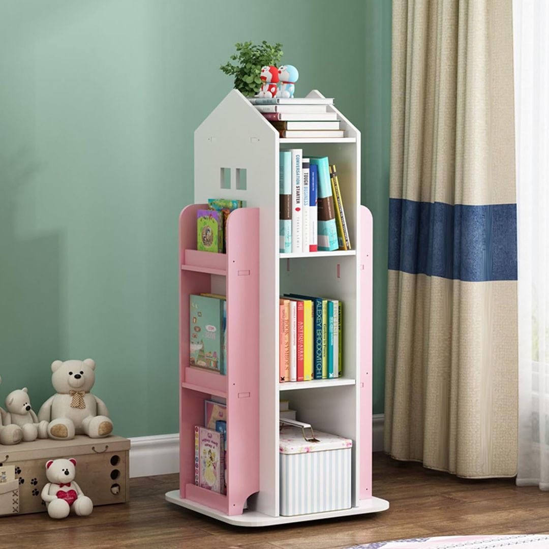 أضف لمسة تنظيم أنيقة لغرفة الأطفال مع مكتبة دوّارة بتصميم مبتكر يشبه البيت، تجمع بين العملية والديكور في قطعة واحدة.