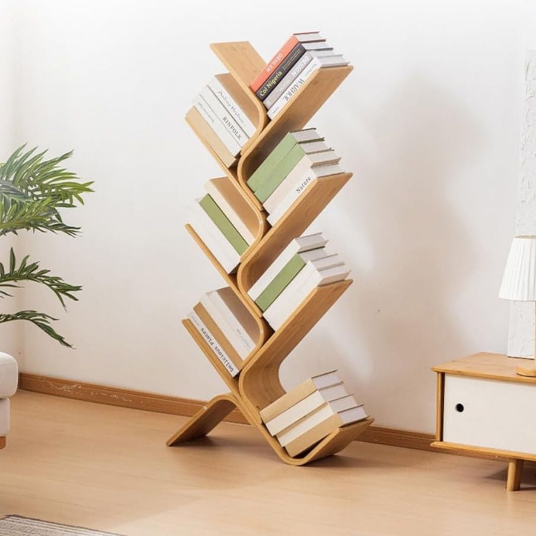 رف خيزران أرضي للكتب بتصميم مميز مستوحى من شكل الشجرة، يوفر حلاً مثالياً لتنظيم الكتب والديكور مع الحفاظ على جمالية المساحة