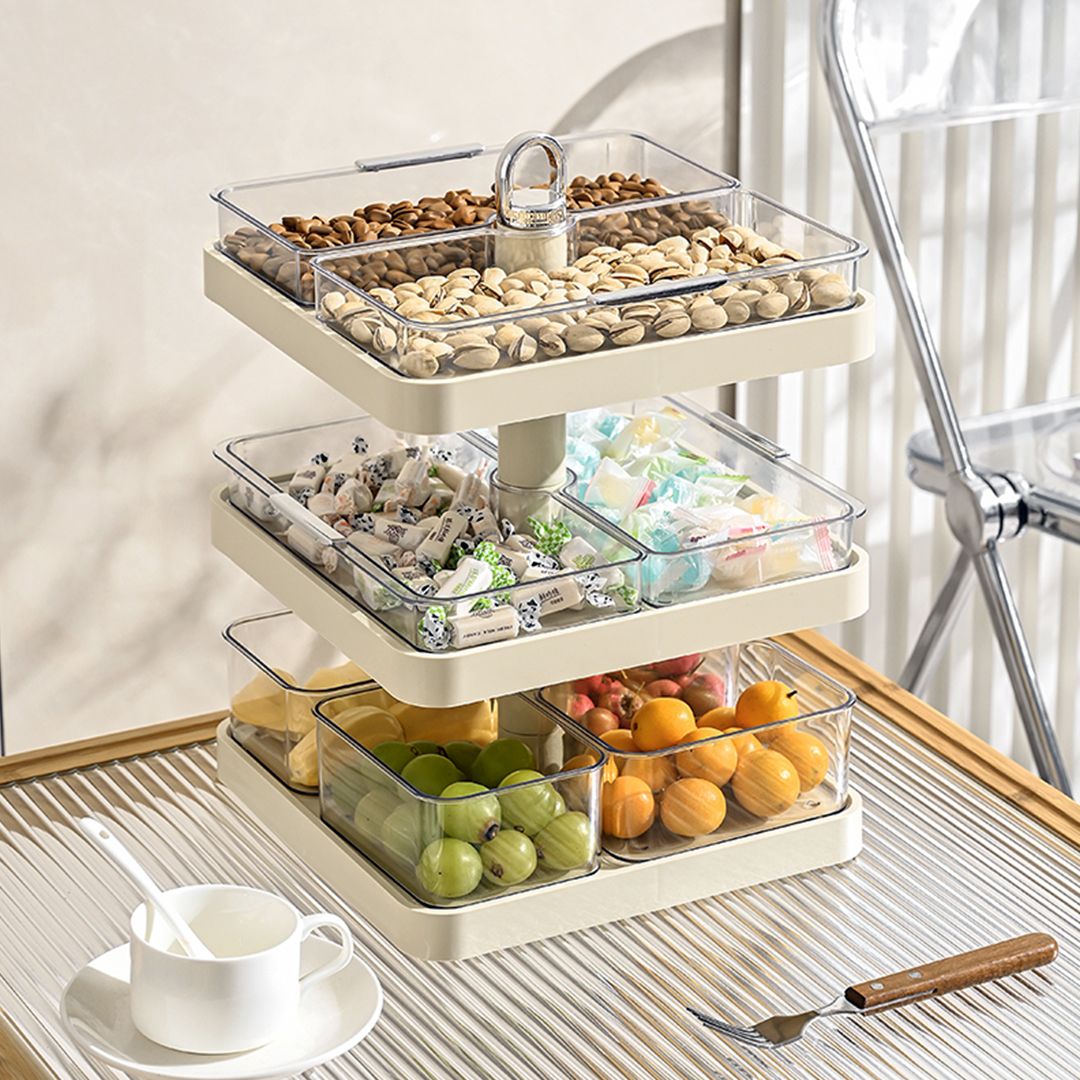 ستاند تقديم أنيق بثلاث طبقات بلون كريمي، مزوّد بعلب شفافة قابلة للإزالة لتنظيم المكسرات والحلويات والفاكهة بطريقة مرتبة وجذّابة، مثالي للضيافة اليومية والحفلات.