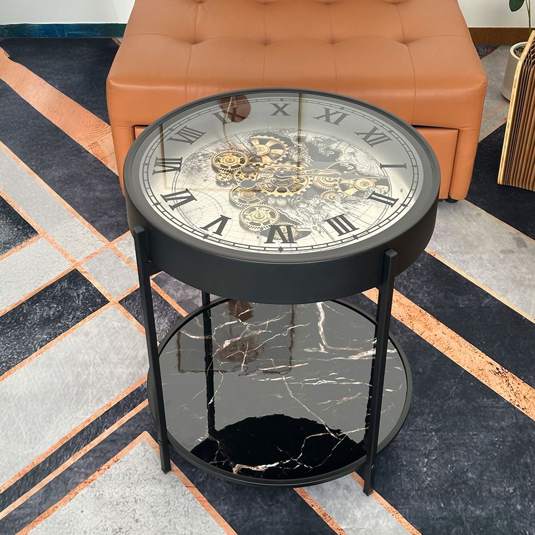 التصميم الفاخر والمبتكر: طاولة جانبية استثنائية تجمع بين الأسلوب الصناعي الراقي واللمسة الكلاسيكية الفخمة. يعلوها سطح ساعة مذهل بتفاصيل تروس ذهبية دقيقة وأرقام رومانية محفورة على خلفية زجاجية شفافة، مما يمنحها حضورًا مهيبًا يجذب الأنظار في أي مساحة توضع فيها. الرف السفلي الرخامي يضيف لمسة عملية وأنيقة، مثالية لعرض الديكورات أو ترتيب الإكسسوارات بطريقة أنيقة ومنظمة.