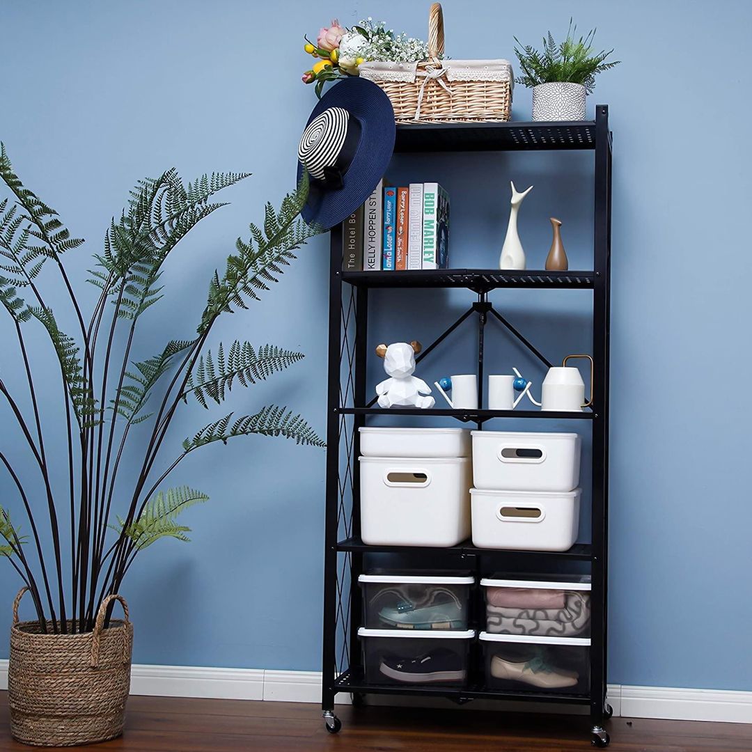 وحدة أرفف معدنية بتصميم عصري لتنظيم الأدوات يمكن طيها من المنتصف، ولا تأخذ حيز كبير عند التخزين يتحمل وزن حتى 30 كيلو لكل رف يتميز بأرجل دوارة 360 ، لتسهيل تنقل الوحدة من مكان الى آخر بسهولة أرفف قابلة للطي، متينة و قوية ، كبير بما يكفي لتخزين الكثير من الأشياء الأرفف مستقرة و يمكن استخدامها ووضع الأشياء عليها دون الخوف من وقوعها او من أن تهتز يمكن وضعها في المطبخ و تخزين اواني الطبخ او علب التوابل او الأدوات الكهربائية الخاصة بالطبخ يمكن ايضا استخدامها في غرف الأطفال لتخزين الألعاب او الملابس و غيرها يمكن استخدامها في الحمام لتخزين ورق الحمام، المناشف و غيرها يمكن ايضا استخدامها في الحدائق لوضع أصص الزهور والنباتات عليها يمكن استخدامها في غرف المعيشة كديكور عصري لوضع الكتب او الديكورات غير قابلة للصدأ و مضادة للماء متوفرة باللون الأسود و الأبيض