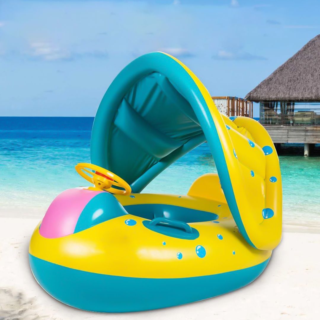 The float is made of environmentally friendly materials and materials that do not irritate the baby's skin A swim buoy with a parasol that protects children from the sun's rays and makes them enjoy the water and swimming Suitable for children from 7 months to 2 years old It has handles that help the child balance when holding the buoy with a toy leash Carries a weight of up to 17 kg The float supports the baby's legs and back, thanks to the comfortable openings for the feet This float is made of high quality materials, which can withstand the heat of the sun, the chlorine in the swimming pool, and the salinity of the sea water. Therefore, it will ensure your child's safety, and it will last for a long time This float is ideal for teaching children, as it will give them the freedom to move around in the water safely and comfortably